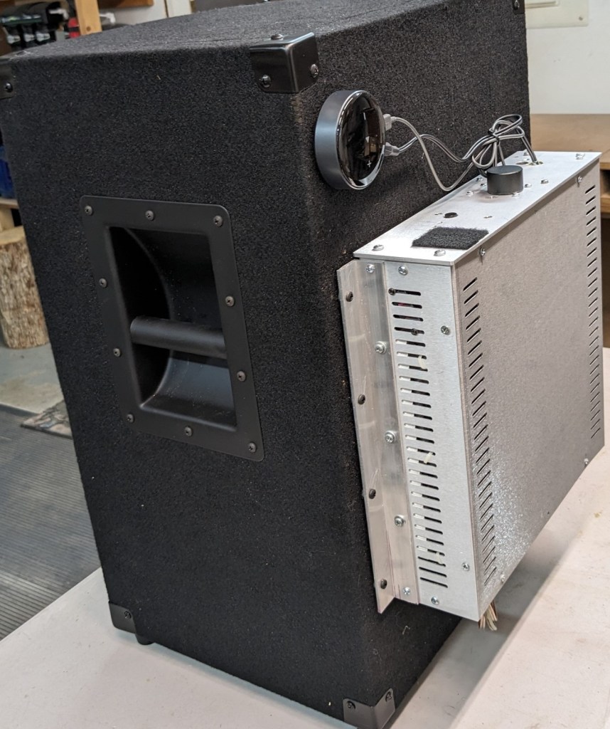 I had already made a large “Hi-Fi” Bluetooth speaker for a friend’s gathering, by adding a Qualcomm Bluetooth module to a 12″ PA speaker that had been modified with a nice Galaxy Audio midrange and Audax horn tweeter. It had a 200W amp and a ready-made 3-way crossover. The crossover had not been optimized for those drivers, yet it still sounded quite good, and made an easy source of audio that could fill the room nicely. Since this formula seemed to work well, I decided to use the same approach to use these fine SEAS drivers. I also had an Icepower 500ASP amp already mounted in a chassis, so I would have plenty of “oomph” to power this speaker.